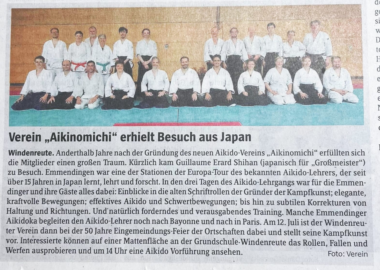 "Anderthalb Jahre nach der Gründung des neuen Aikido-Vereins "Aikinomichi" erfüllten sich die Mitglieder einen großen Traum. Kürzlich kam Guillaume Erard Shihan [...] zu Besuch."